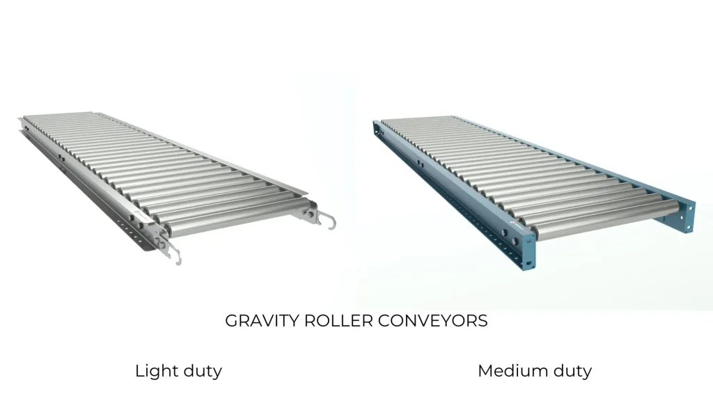 Variations of gravity roller conveyors are available: light-duty gravity roller conveyors, medium-duty, and heavy-duty gravity roller conveyors.