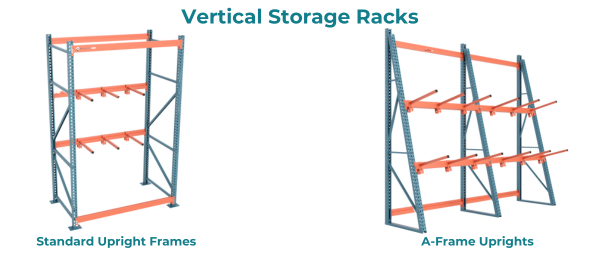 - Vertical A-frame racks with divider arms maximize floor space by storing materials upright.