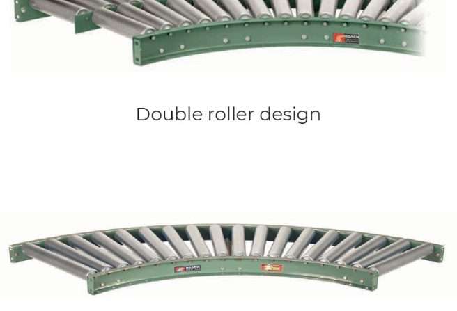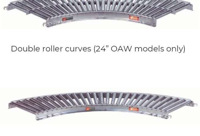 There are also two types of curved gravity roller conveyors: single and double roller curves. Gravity conveyor roller capacity is available from 250 to 540 lbs. per roller.
