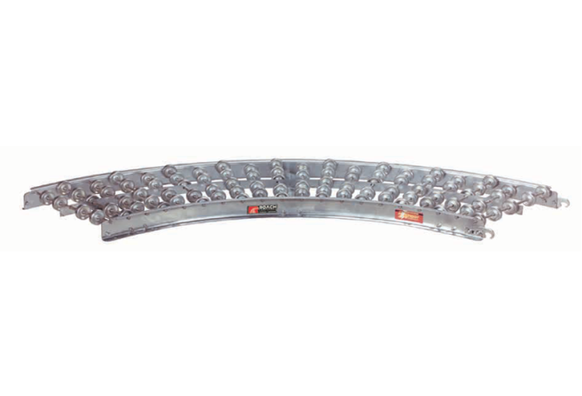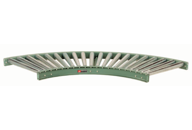 There are various models of straight and curved gravity roller conveyors. Curves with a 4′-0″ inside radius are manufactured in 45-degree sections and require full support at the center of the curve.