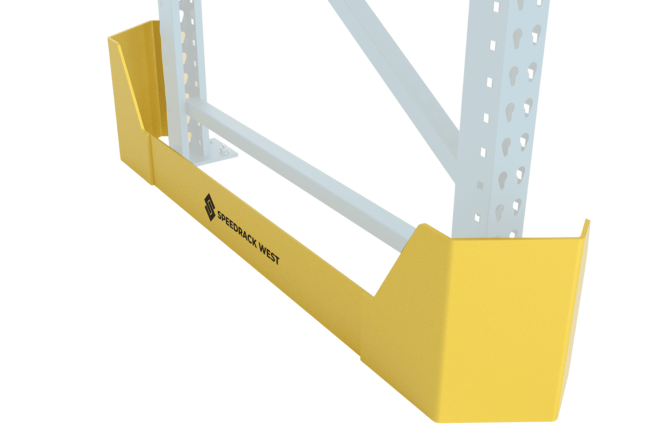 A pallet racking column guard, like this one, protects the end of your pallet racks. The guard asborbs the force from accidental contact with a forklift, pallet jack, or other devices or smaller vehicles.