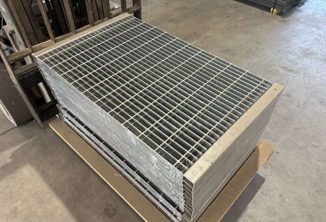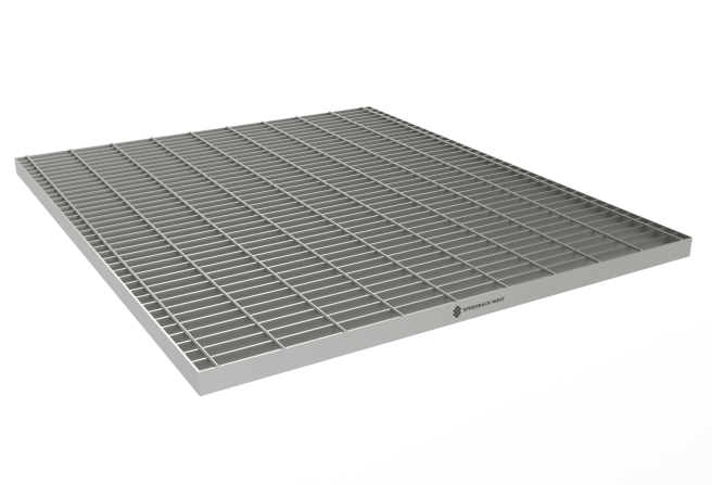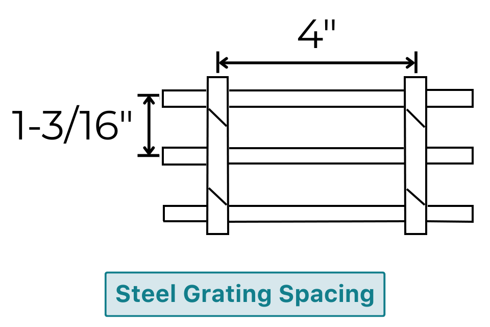 The specific style we offer is 19-W-4 grating: bearing bars spaced 1-3/16″ on center, cross bars at 4″. This pattern provides 78% open area, making it ideal for airflow, drainage, and sprinkler compliance in warehouse storage applications.