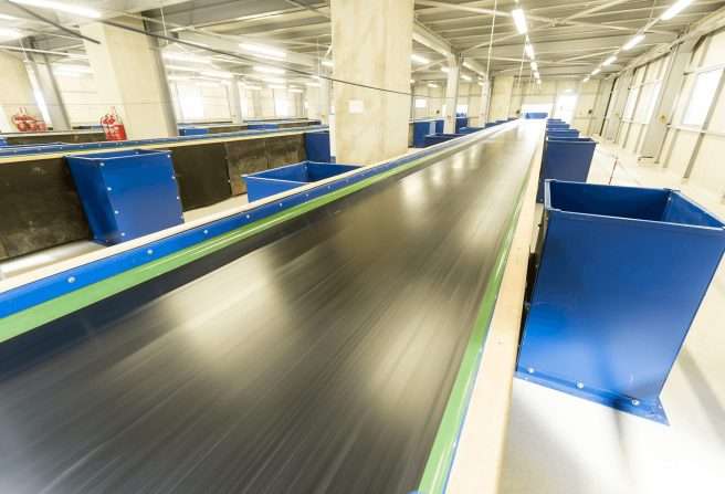 Slider bed conveyors have a belt that slides along a solid surface. This particular version also has troughed rails on either side to keep bulk material confined to the belt situated in between. It is designed to keep work areas and internal parts clear while keeping loose material moving along the conveyor. Textured & cleat topped belts can also be used.