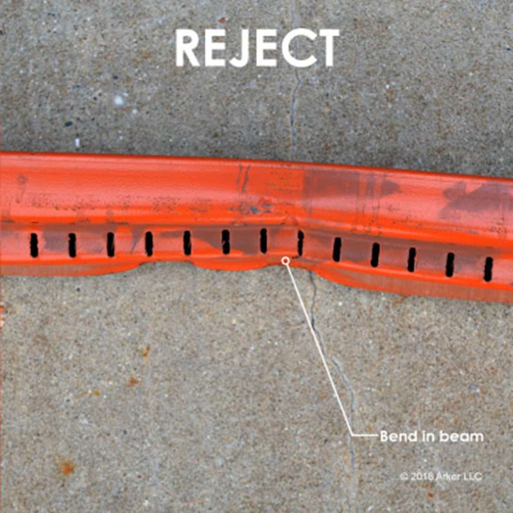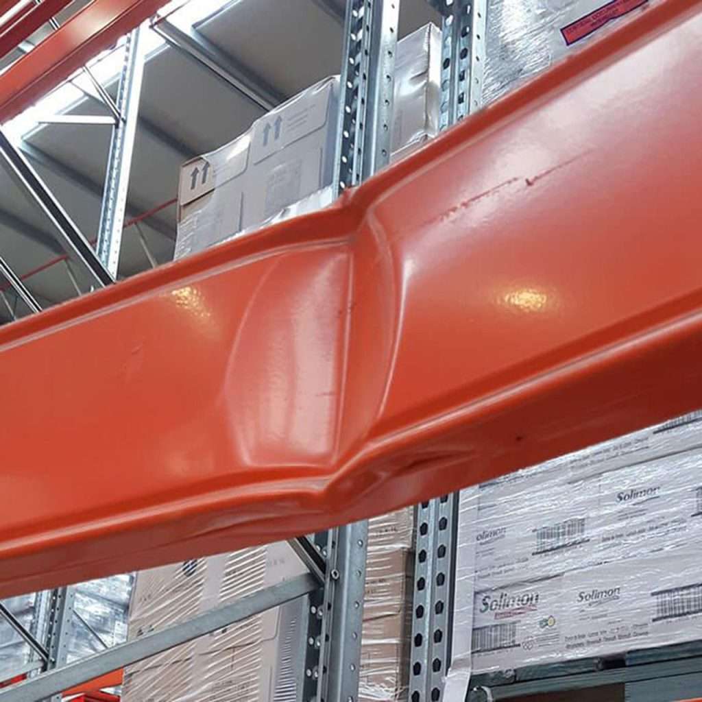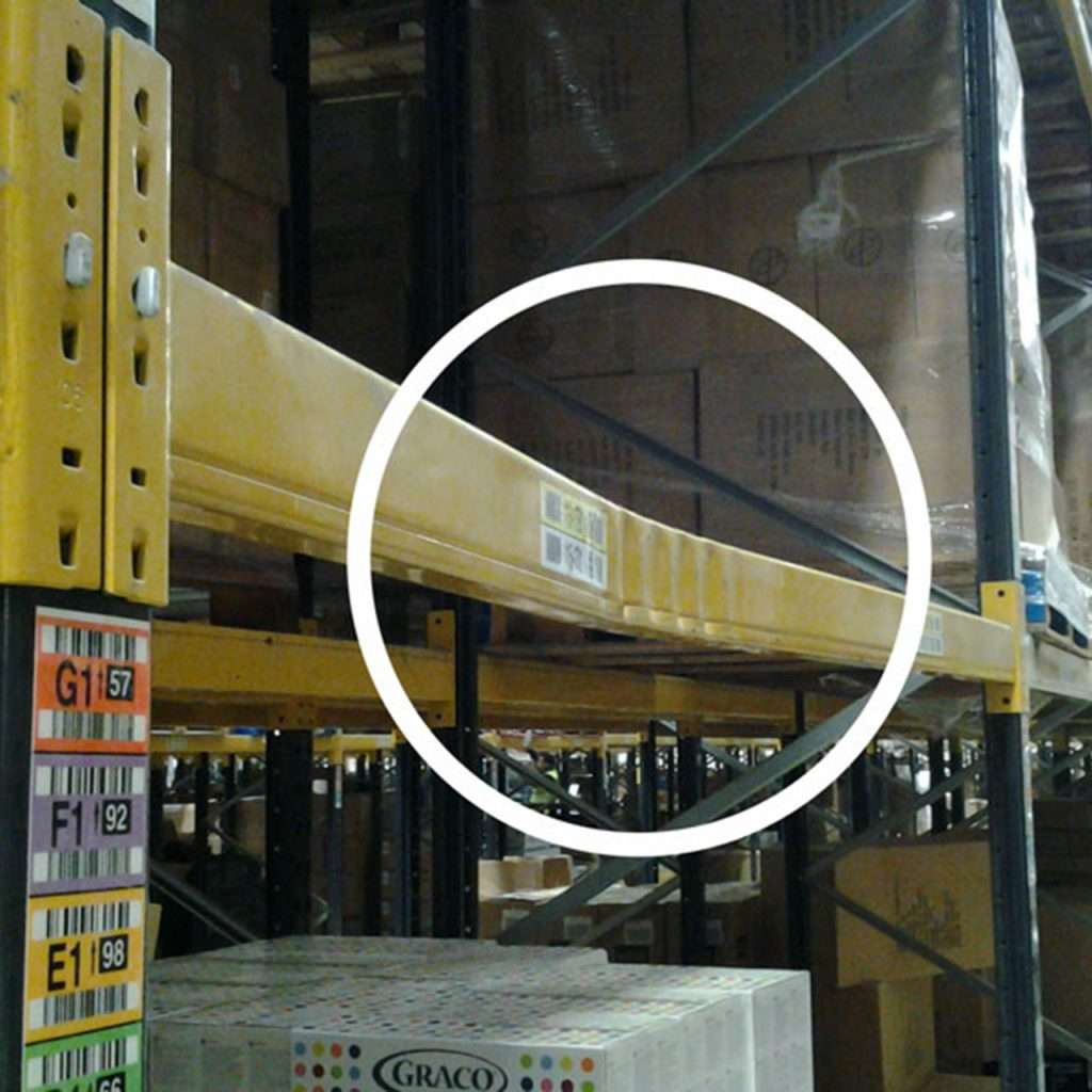 Indicates impact or overloading — the structure may be weakened beyond repair. Any frontal deflection of uprights exceeding 1/8″ within a 40″ span, lateral deflection over 2/8″, or brace deflection (horizontal or diagonal) exceeding 3/8″ is considered critical.
