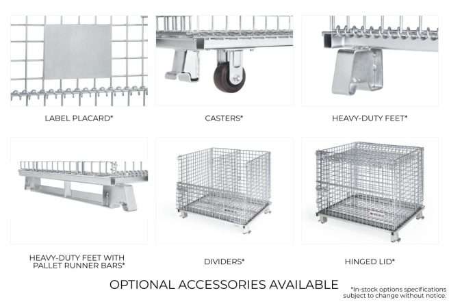 What accessories or customization options are available for wire containers?