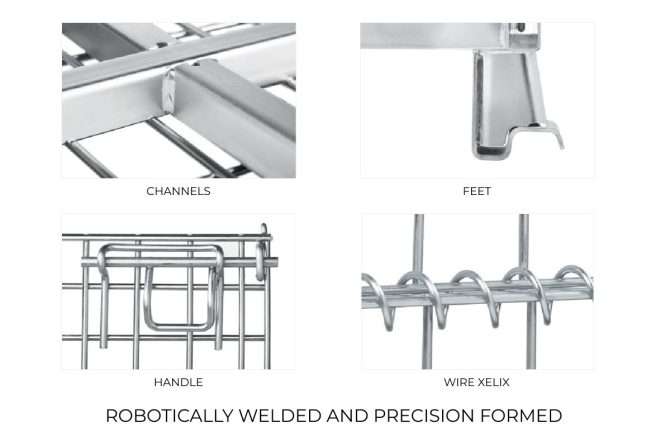 High-quality electro galvanized finish make our industrial wire baskets run a long life. Wire mesh containers are designed to serve for at least 10-12 years due to steel mesh they are made of and robotically welded feet and understructure.