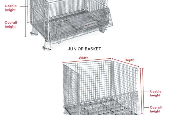 All our containers are collapsible due to their half drop front gate and stackable for better storage and transportation of large wire baskets.